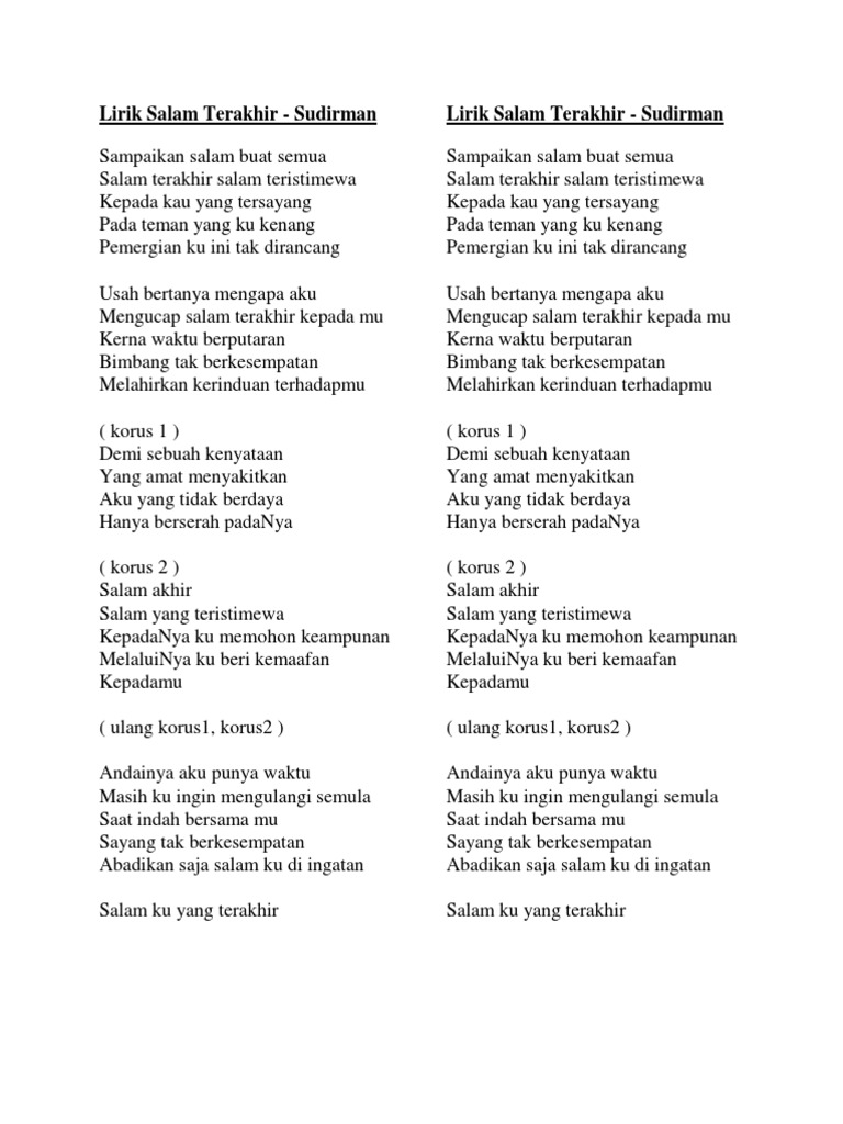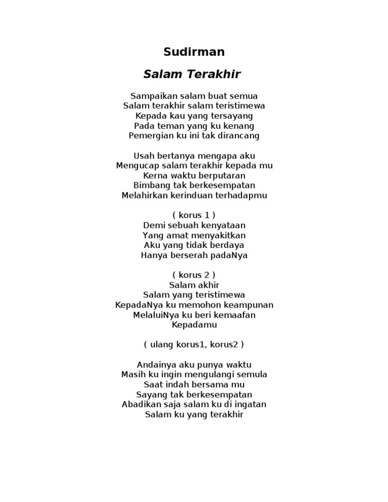 Lirik Lagu-Lagu Sudirman TERIRING DOA. Salam terakhir salam teristimewa. Kematianku ini tak dirancang usah bertanya mengapa aku bimbang tak berkesempatan aku yang tidak berdaya hanya berserah padamu salam akhir salam yang.